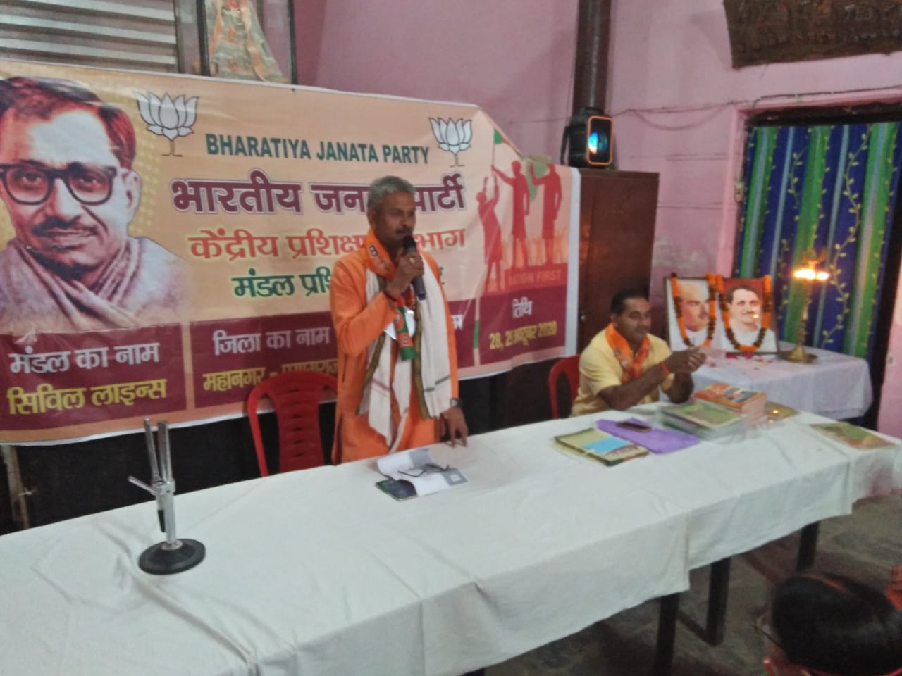 28 अक्टूबर 2020 प्रयागराज, भाजपा सिविल लाइन मंडल के द्वारा आयोजित केंद्रीय प्रशिक्षण महा अभियान का शुभारंभ रॉयल गार्डन सिविल लाइन में किया गया इस अवसर पर भाजपा महानगर अध्यक्ष श्री गणेश केसरवानी जी ने कार्यक्रम का शुभारंभ करते हुए पंडित दीनदयाल उपाध्याय एवं डॉ श्यामा प्रसाद मुखर्जी के सचित्र पर पुष्प अर्पित करते हुए भाजपा का इतिहास एवं विकास पर विचार प्रकट करते हुए कार्यकर्ताओं से कहा कि भाजपा का जन्म त्याग की पृष्ठभूमि पर हुआ है जिसने कभी भी अपने सिद्धांतों के एवं विचारों के साथ समझौता नहीं किया जबकि अन्य दलों का जन्म सत्ता प्राप्ति के लिए एवं अपना निजी स्वार्थ साधने के लिए हुआ है वहीं भाजपा का इतिहास त्याग एवं बलिदान से भरा पड़ा है