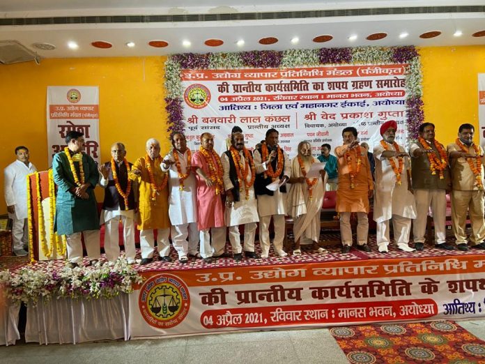 आज दिनांक 04/04/2021 को अयोध्या में उत्तर प्रदेश उद्योग व्यापार प्रतिनिधी मंडल की प्रांतीय कार्यसमिति का शपथ ग्रहण समारोह सम्पन्न हुआ । दिनांक 14/03/2021 को लखनऊ में प्रदेश की प्रांतीय कार्यसमिति का 102 पदों पर चुनाव हुआ था । जिसमें श्री बनवारी लाल कंछल छट्टवि बार प्रांतीय अध्यक्ष , प्रयागराज से श्रीमती अनीता जैसवाल पाँचवीं बार महिला की प्रदेश अध्यक्ष एवं प्रयागराज से श्री विजय अरोरा पाँचवीं बार प्रांतीय वरिष्ठ उपाध्यक्ष चुने गए थे ।