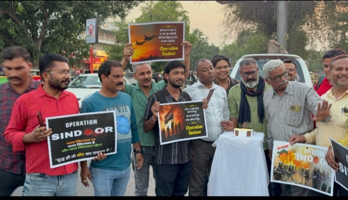 पहलगाम आतंकी हमले में मारे गए लोगो की आत्मा की शांति के लिए भारत सरकार के द्वारा आतंकी ठिकानों पर हमला कर के आतंकवादियो को मार गिराने की ख़ुशी मे जहाँ पूरे देश की जनता ख़ुशी मना रही है वही प्रयागराज के मीडिया कर्मियों ने अनोखे अंदाज मे अपनी ख़ुशी का इज़हार किया बता दे प्रयागराज इलेक्ट्रॉनिक मीडिया क्लब के सदस्यो द्वारा पाकिस्तान मे मारे गए आतंकवादी ठिकानों को नेस्तनाबूत करने की खुशी मे इलेक्ट्रॉनिक मीडिया क्लब के संयोजक श्री वीरेंद्र पाठक जी वह इलेक्ट्रॉनिक मीडिया क्लब के सभी सदस्यों द्वारा आज प्रयागराज के सुभाष चौराहे पर केक काट कर वा पताका जाला कर अपनी ख़ुशी का इजहार किया वही एक दुसरे को मिठाई खिला कर भारत द्वारा पाकिस्तान हमले आतंकवादी संघठन के खात्मे की ख़ुशी मनाई गई इस अवसर पर वरिष्ठ पत्रकार संदीप तिवारी जी सय्यद मोहम्मद आमिर आरिज खान पवन उपाध्याय शैलेश सिंह यादव मोहम्मद लईक आरव भारद्वाज शिशिर गुप्ता श्यामू कुशवाह गगन सिंह मौजूद रहे।