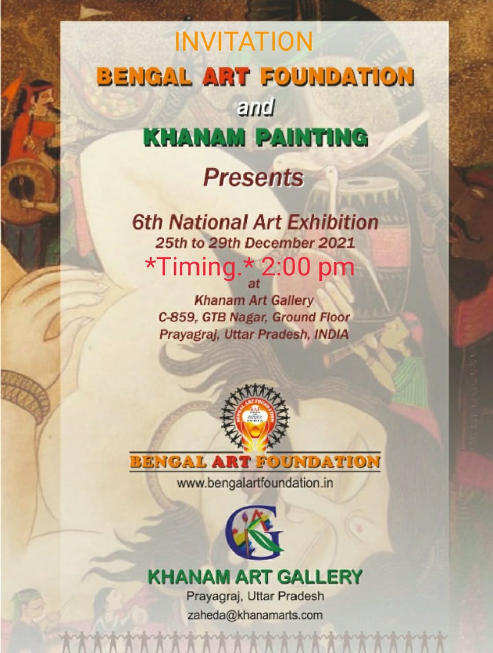 प्रयागराज की खानम आर्ट गैलरी में आज बंगाल आर्ट फाउंडेशन और खानम पेंटिंग की तरफ से छठवें नेशनल आर्ट एग्जिबिशन की शुरुआत होने जा रही है जिस का भव्य शुभारंभ दोपहर 2:00 बजे से रखा गया है यह एग्जीबिशन 25 दिसंबर से 29 दिसंबर 2021 तक चलेगा कार्यक्रम की खास बात यह है प्रयागराज में पहली बार इस तरह का कोई आयोजन किया जा रहा है इस आयोजन में तमाम दिग्गज कलाकार पार्टिसिपेट करेंगे युवा कलाकारों के लिए एक खास मौका रहेगा की उन कलाकारों के सानिध्य में कुछ नया सीखे कार्यक्रम को लेकर खानम आर्ट गैलरी की डायरेक्टर डॉ जाहिदा खानम ने बताया की गैलरी की कोटेड रही है हमेशा कला के क्षेत्र में कलाकारों को आगे बढ़ाना अभी हाल ही में गैलरी ने अपना 1 वर्ष पूरा किया है इसी उपलक्ष में यह कार्यक्रम आयोजित किया जा रहा है उन्होंने कहा कार्यक्रम में देशभर के कलाकार हिस्सा लेंगे और नए कलाकारों के लिए यह एक सुनहरा सुनहरा अवसर है कि उन कलाकारों के साथ मंच साझा करें और कुछ नया सीखे उन्होंने यह भी बताया कि कार्यक्रम में काफी संख्या में कलाकार पार्टिसिपेट कर रहे हैं जिसमें सीनियर और जूनियर कलाकारों की जुगलबंदी दिखाई पड़ेगी राज्य ललित कला अकैडमी के मेंबर भी इस कार्यक्रम में पार्टिसिपेट करेंगे और अपने हुनर को कलाकारों के सामने प्रदर्शित करेंगे खास बात कार्यक्रम की यह रहेगी इस कार्यक्रम में पार्टिसिपेट करने वाले कलाकारों को पुरस्कृत भी किया जाएगा ताकि कला के क्षेत्र में उनका मनोबल बढ़े और ज्यादा से ज्यादा कलाकार इस कार्यक्रम का हिस्सा बने इसके साथ-साथ उन्होंने कलाकारों को गैलरी में आने का आमंत्रण भी दिया।