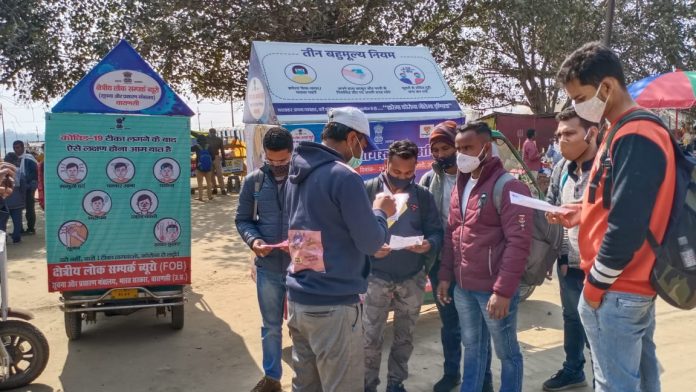 क्षेत्रीय लोकसपंर्कब्यूरो, प्रयागराज द्वारा जनमानस में कोविड-19 टीकाकरण और स्वच्छता को लेकर चलाये जा रहे अभियान के अंतर्गत आज विभाग के शिविर में लखनऊ, वाराणसी और प्रयागराज के कलाकारों द्वारा प्रस्तुत किये गये कार्यक्रमों की उपस्थित दर्शकों द्वराा खूब सराहना की गयी। लखनऊ से आये सर्वेश श्रीवास्तव द्वारा प्रस्तुत किये गये हास्य, व्यंग्य के कार्यक्रम में दर्शकों ने उनका उत्साहवर्धन तालियाँ बजाकर किया। दूरदर्शन आकाशवाणी के मशहूर नक्कारावादकमो0 सलाम ने अपनी प्रस्तुति से कला प्रेमियों का मन मोह लिया। प्रयागराज की स्मृति शुक्ला द्वारा प्रस्तुत किये गये भजनों तथा गणेश तथा शिव वंदना पर लखनऊ के कलाकार उत्तम कुमार के नृत्य प्रदर्शन का भी लोगों ने भरपूर स्वागत किया। वाराणसी से आये लोकगीत तथा बिरहा कलाकारों के दल कन्हैया लाल यादव एण्ड पार्टी द्वारा प्रस्तुत किये गये कार्यक्रम की भी दर्शकों द्वारा सराहना की गयी। विशेष रूप से लोक गायक कन्हैया लाल यादव और लोक गायिका अनीता राव द्वारा प्रस्तुत किये गये गीतों पर विभाग के शिविर में तालियाँ बजाकर उत्साहवर्धन किया गया। कोविड-19 से बचना-बचाना है बात मान लो, सबको टीका है लगवाना मेरी बात मान लो’ गीत जब प्रस्तुत किया गया तो बिना मास्क लगाये दर्शकों द्वारा अपनी नाक और मुँह को गमछा और रूमाल से ढ़क लिया गया। कार्यक्रम में मौजूद विभाग के उपनिदेशकआरिफ हुसैन रिजवी ने बताया कि प्रतिदिन 12 बजे के बाद से शिविर में उत्तर प्रदेश के विभिन्न भागों से आये हुए कलाकारों द्वारा मनोरंजक और ज्ञानवर्धक कार्यक्रमों का यह सिलसिला 27 फरवरी तक लगातार जारी रहेगा। उन्होंने फिर कहा कि टीकाकरण पूरी तरह सुरक्षित है और इसका प्राथमिकता के आधार पर लाभ प्राप्त करने के लिए अपना पंजीकरण कराना जरूरी है। विभाग के कार्यक्रम में लखनऊ मुख्यालय से आये संयुक्त निदेशक सुनील कुमार शुक्ल सहित बड़ी संख्या में शहरी और ग्रामीण क्षेत्र के गणमान्य नागरिक मौजूद थे।