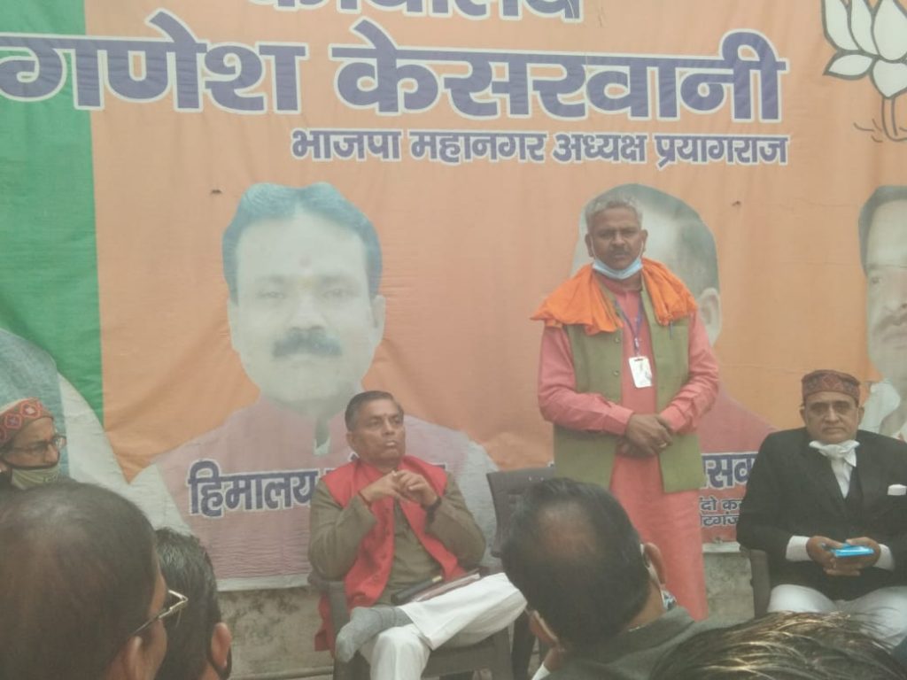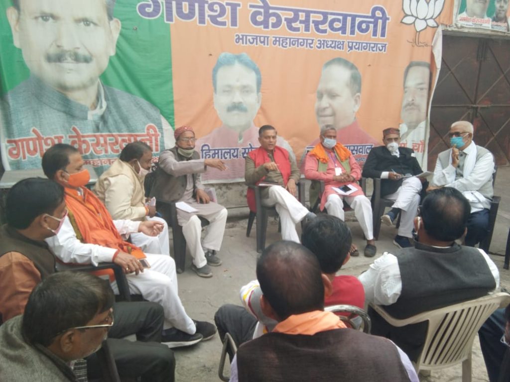 27 नवंबर 2020 प्रयागराज, भारतीय जनता पार्टी महानगर कार्यालय कीडगंज में आयोजित शहर दक्षिणी विधानसभा के कार्यकर्ताओं की बैठक में मुख्य अतिथि के रुप में आए श्री ओम प्रकाश जी ने उपस्थित कार्यकर्ताओं से कहा कि इलाहाबाद झांसी स्नातक विधान परिषद चुनाव की सारी जिम्मेदारी आप सभी पर है इसलिए सभी कार्यकर्ता मतदाताओं से संपर्क करके हर परिस्थिति में उनके साथ अपने आचार व्यवहार से प्रभावित करके भारतीय जनता पार्टी के पक्ष में मत डलवाने का कार्य करें।