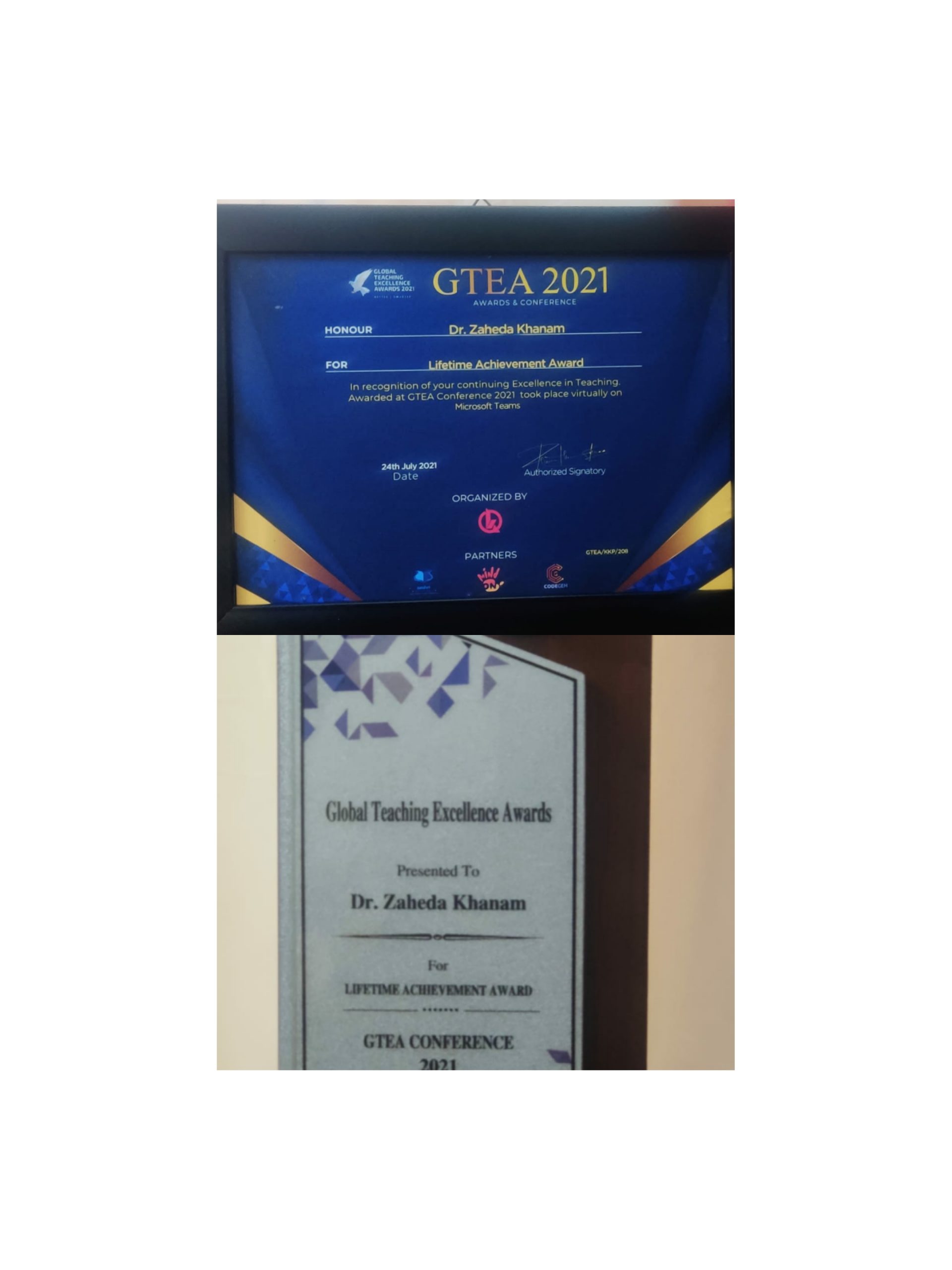 Global Teaching Excellence Award 2021 से Dr Zahida khanam को नवाजा गया